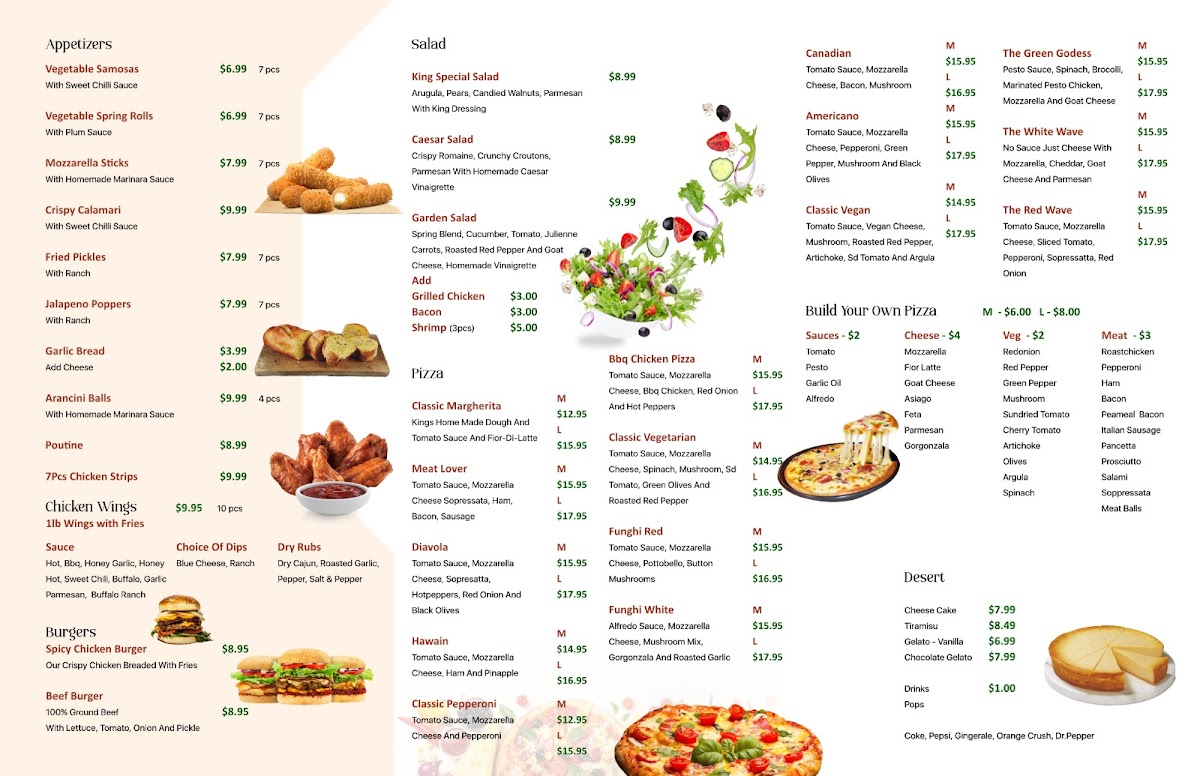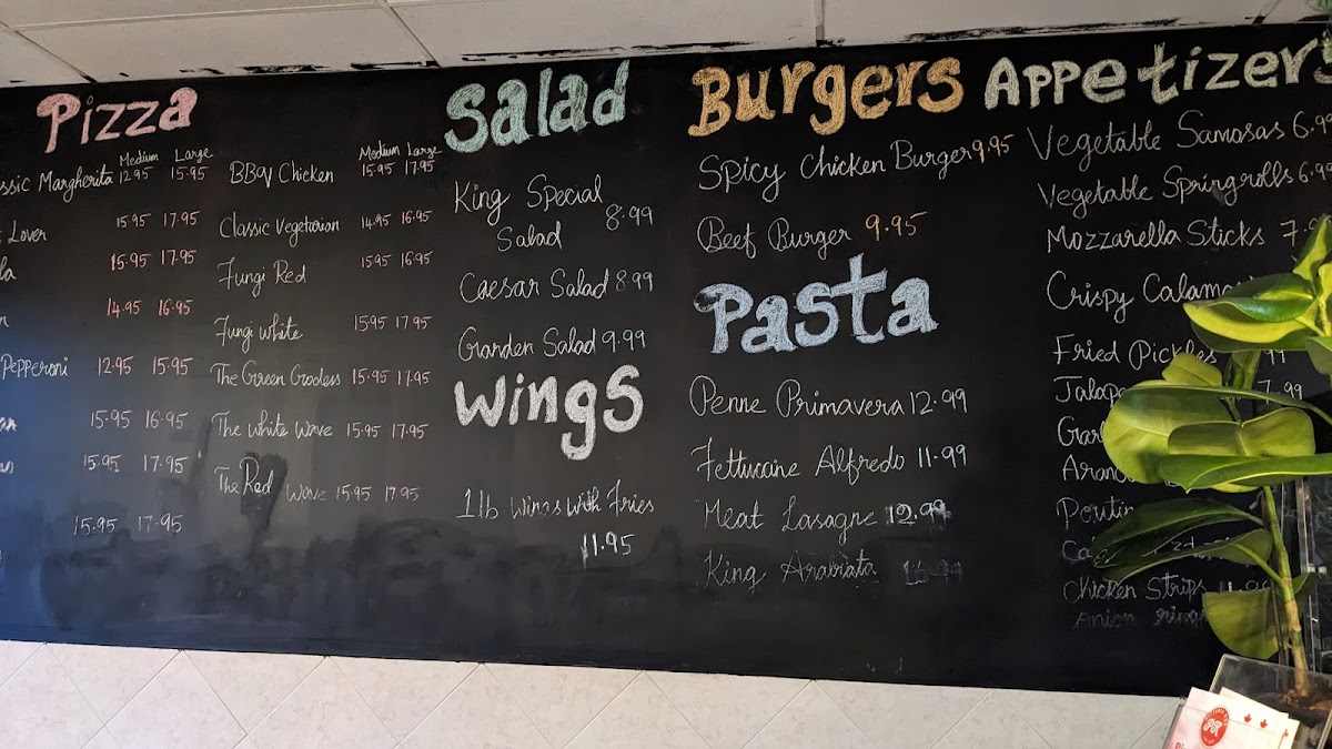 As you peruse the menu, you'll find a tempting array of appetizers, including Vegetable Samosas, Mozzarella Sticks, Fried Pickles, and more. The Chicken Wings are a must-try, especially when paired with a cold beer. And don't miss out on the King Special Salad, a refreshing blend of arugula, pears, candied walnuts, and Parmesan topped with a king dressing.